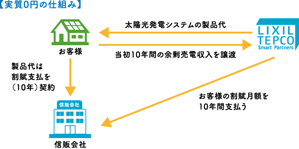 建て得は、ZEHを建てる際にLIXIL TEPCOスマートパートナーズと契約できるサービスで、LIXIL TEPCOスマートパートナーズから太陽光発電システムを10年ローンで購入し、余剰売電収入を10年間譲渡することでローン支払負担を相殺し、「実質0円」にする仕組みのことです。