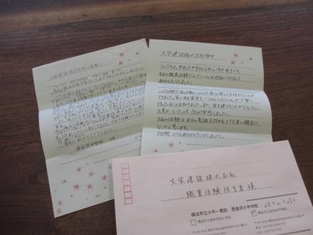 Blog ブログ 2013.02.25 スタッフブログ イベント情報 職業体験 職業体験のお礼状 こんにちは♓ 最近、うちの金魚の巨大化にビックリしている古木です 小さい方が可愛いのに・・・ 今日は職業体験をした二人がお礼状を持ってきてくれました✨ 担当の小林洋介がスタッフを代表して頂きました✨ 3人でパチリ ✨ 2人からのお手紙、とても嬉しかったです ありがとうございました!今度は遊びに来てね~✨ 横浜で高性能な注文住宅・リノベーションをおこなう工務店「大栄建設」 大栄建設の家は、ただ住むだけでなく、家族の笑顔あふれる、そんな場所。 まるで森にいるかのような上質な空気に包まれ、毎日をリフレッシュできます。 大切なご家族を守るため、快適で省エネな暮らしを実現するため、私たちは以下の基準で設計しています。 ・断熱性能 (UA値): 0.46W/㎡K 以下 (HEAT20 G2基準) ・気密性能 (C値): 0.5㎠/㎡ 以下 (全棟気密測定実施) ・耐震性能:耐震等級3 (最高等級) ・設計思想:自然の力を活かすパッシブデザインを採用 実際の暮らし心地は、横浜市金沢区のモデルハウスで見学・宿泊体験が可能です。 資金計画や間取りのご相談も随時受付中です。 「澄み渡る空気の、住み渡る家づくり」を、私たちと一緒に叶えませんか? ▼大栄建設の家づくりを体感する 前へ ブログ一覧へ 次へ